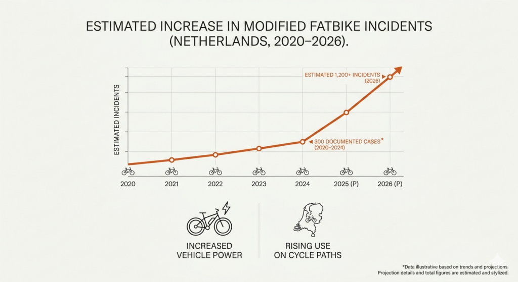 - Modified fatbikes in the Netherlands have been recorded reaching 40–50 km/h on shared cycle paths designed for 15–20 km/h traffic; Dutch ER visits for young e-bike riders doubled between 2020 and 2024